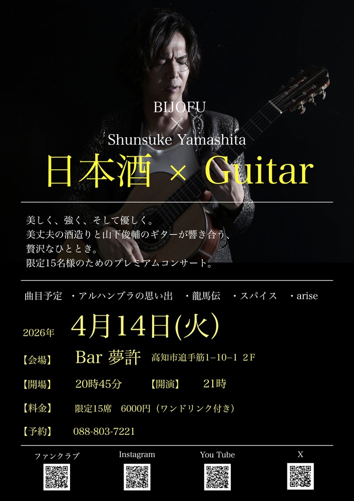 日本酒×Guitar LIVE 2026/04/14(火) 21:00 - 22:00 Bar 夢許 地図を表示 4月14日 【会場】Bar 夢許 【開場】20時45分 【開演】21時 【料金】6000円(ワンドリンク付き) 【予約】0888037221 URLをコピーする 報告する