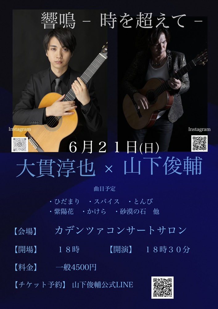 響鳴-時を超えて- LIVE 2026/06/21(日) 18:30 - 20:00 カデンツァコンサートサロン 地図を表示 6月21日(日) 【出演】 大貫淳也gt 山下俊輔gt 【会場】カデンツァコンサートサロン 東京都文京区本郷7-2-2本郷ビル地下1階 【開場】18時 【開演】18時30分 【料金】4500円 予約 山下俊輔公式LINE URLをコピーする 報告する
